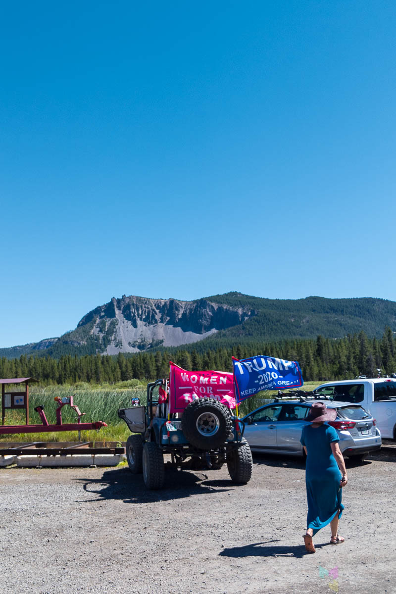 There was just a little bit more climbing until Paulina Lake, which had a vague European Alps feel to it – other than the Jeeps with Trump flags… Anyway, the lake was beautiful, calm, and ringed by beautiful woodland and rocky peaks.